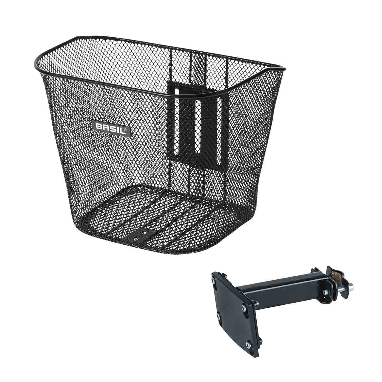 Basil BREMEN, Designkurv foran, stål, mesh, fast montering på styr frempinde, med TÜV-godkendt Basil Fast monteret frempindsholder (70183) til 22-25,4mm Ø styr frempinde (pakket i kurv), kurv justerbar i højden, sort