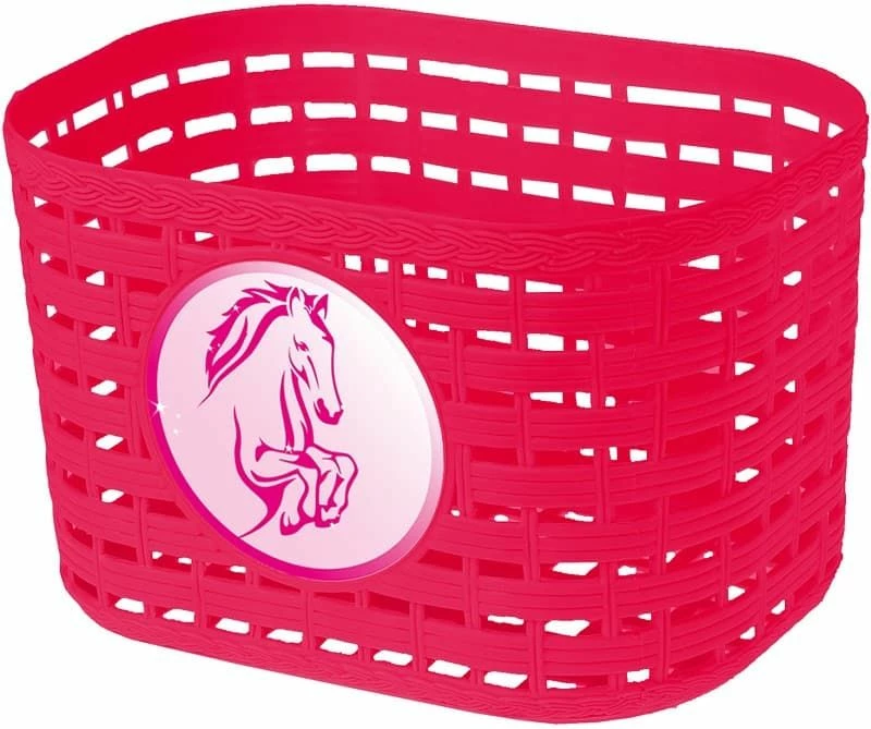 Super sød cykelkurv til børnecykler. Kurven har en flot pink farve og på selve kurven sidder der et billede af en fin hest.