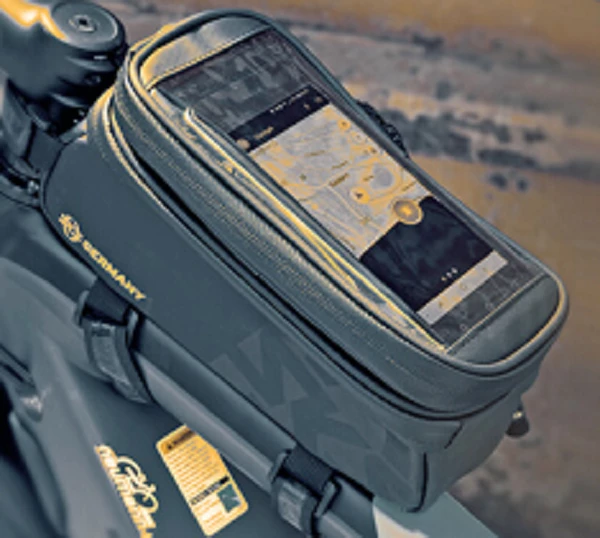 Tasken der er lavet i vandtæt materiale, er øverst udstyret med et aftageligt smartphone etui. Etuiet er gennemsigtigt og med touch så du kan anvende din telefon mens den ligger godt beskyttet. Desuden er der mulighed for at tilslutte en hovedtelefon mens telefonen er i plastiklommen.